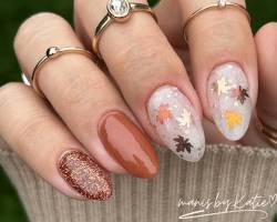 A combination of metallic leaf touches (gold or copper), maybe with an accent nail that has leaf-shapes, set against deep base colours.
